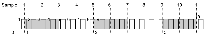 (svislé přerušované čáry označují okamžiky vzorkování, číslice u hrany signálu určují skutečný počet impulsů signálu, číslice pod časovou osou