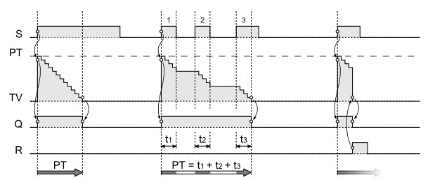Časovač nastaví výstup Q na hodnotu Log.1 po uplynutí doby PT (preset time) nebo je-li součet dílčích dob stavu řídícího vstupu větší než přednastavená