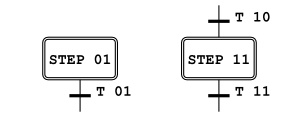 Přechodová podmínka (Transice), viz obrázek 4 (podmínka T 02), odděluje zpracování jednotlivých kroků a binární charakter (například přímo vstup PLC) a zpracování pokračuje dále teprve tehdy, pokud je podmínka splněna. Podmínka může být vyjádřena v zobrazení FBS/FBD nebo KOP/LAD včetně porovnávání hodnot, dotazu na stav časovače, čítače. Přechodová podmínka se umisťuje mezilehle mezi dva kroky pokud nedochází k větvení programu nebo před/za větvení podle typu větvení. |